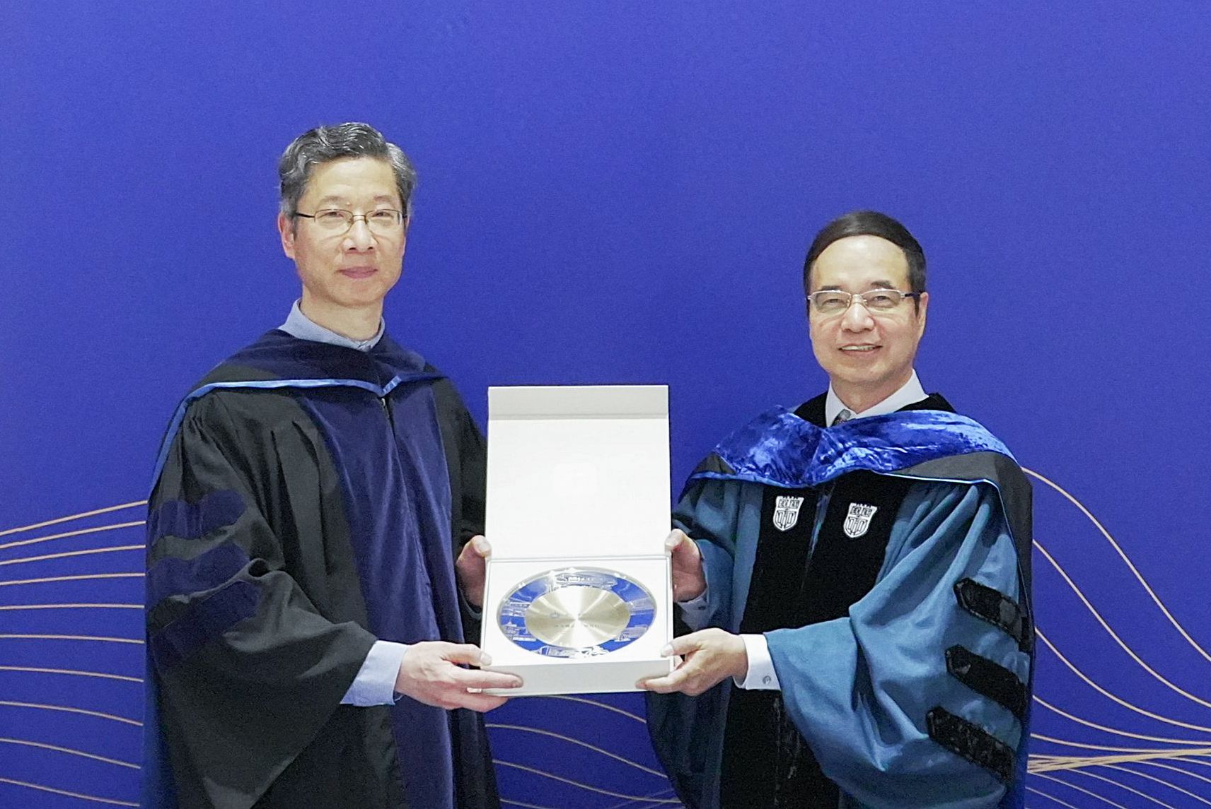 北师港浸大副校长(学术)周永明教授(右)向姚新教授致送纪念品