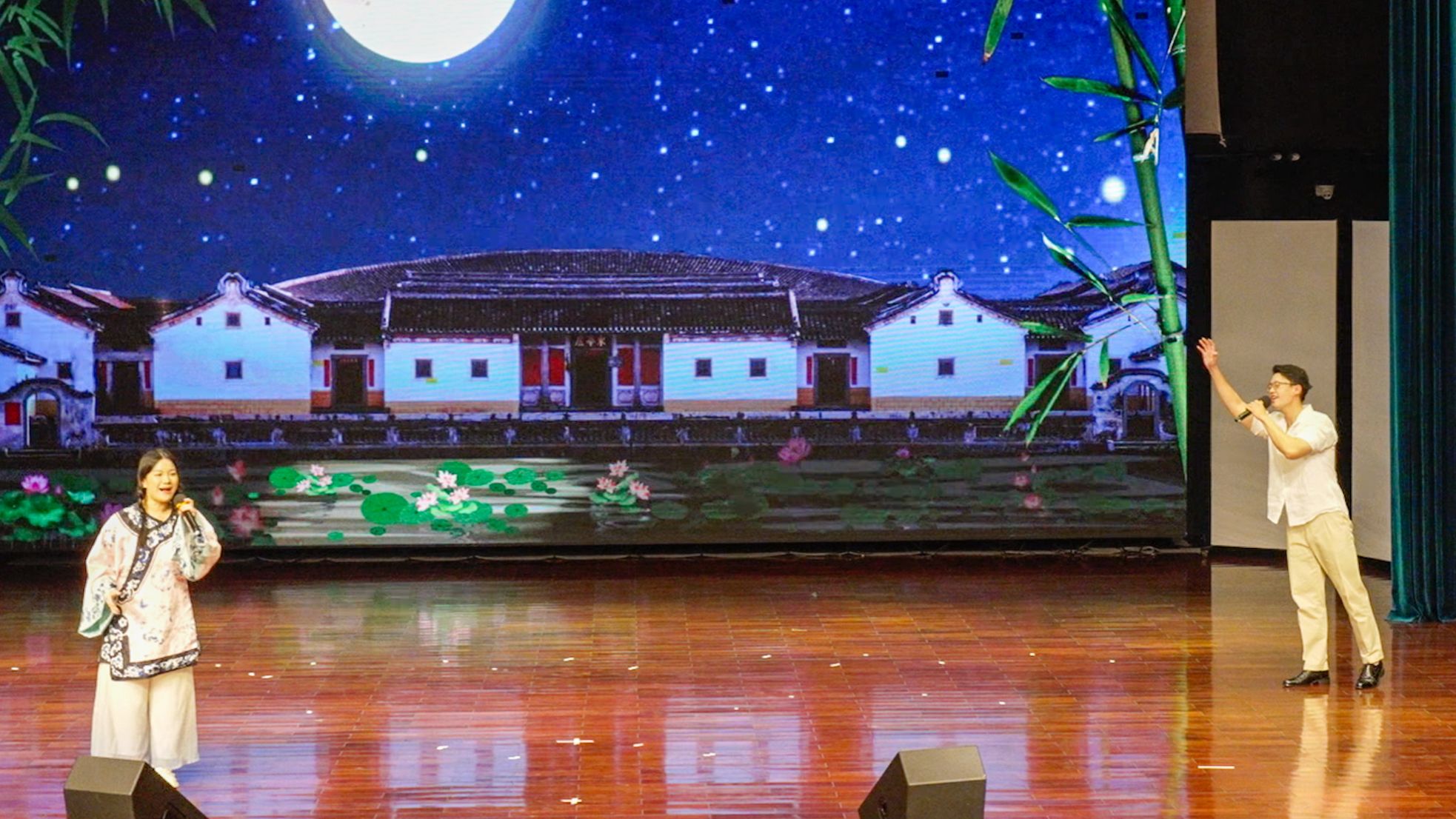 令人惊喜的是,节目《荷塘对歌》的两位表演者,均为北师港浸大在读学生——来自文化与创意管理系的曹堡钧同学与音乐系的曾宸同学,用精湛的演绎赢得了满堂喝彩,不仅展现了客家山歌的感人魅力,也印证了非遗传承在青年一代中的生机。