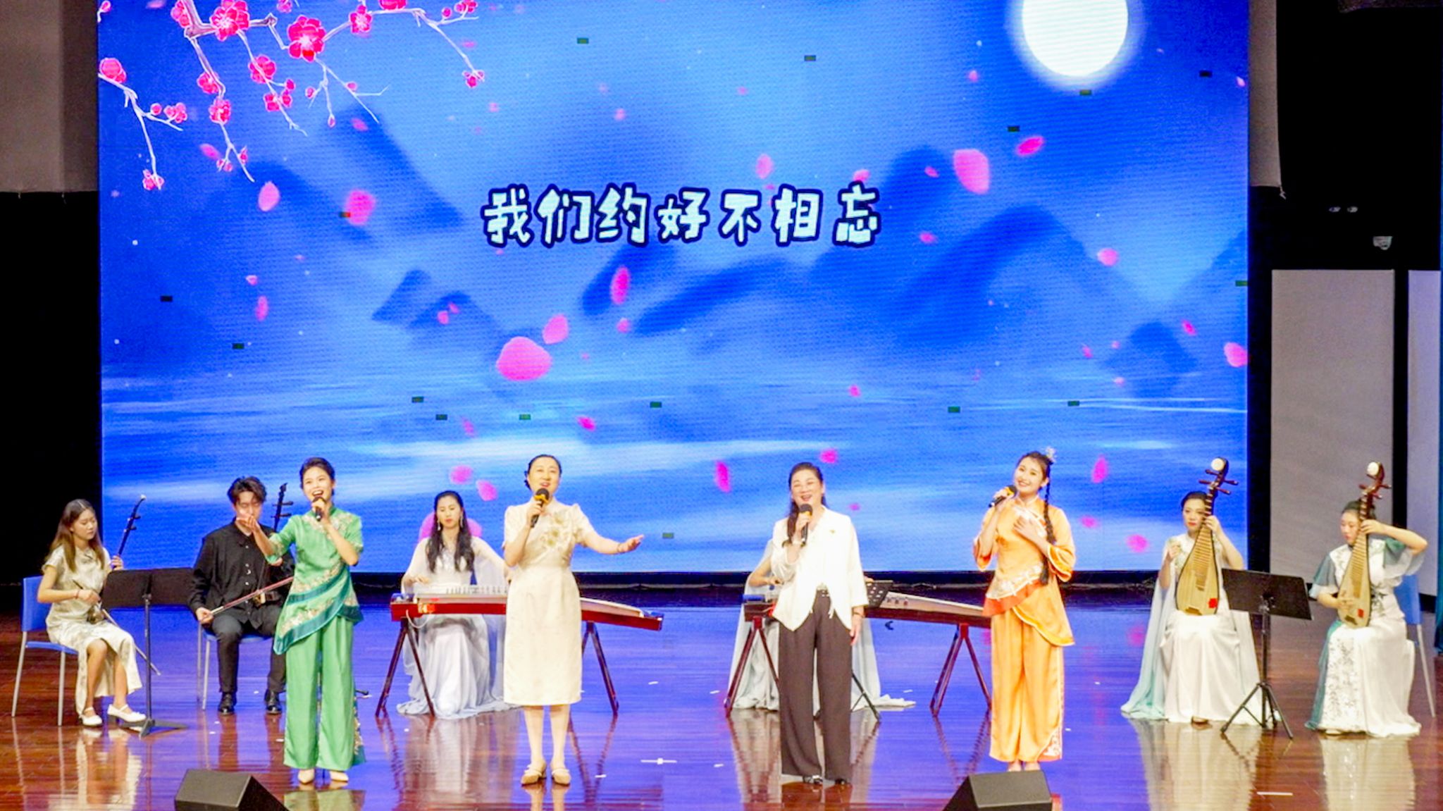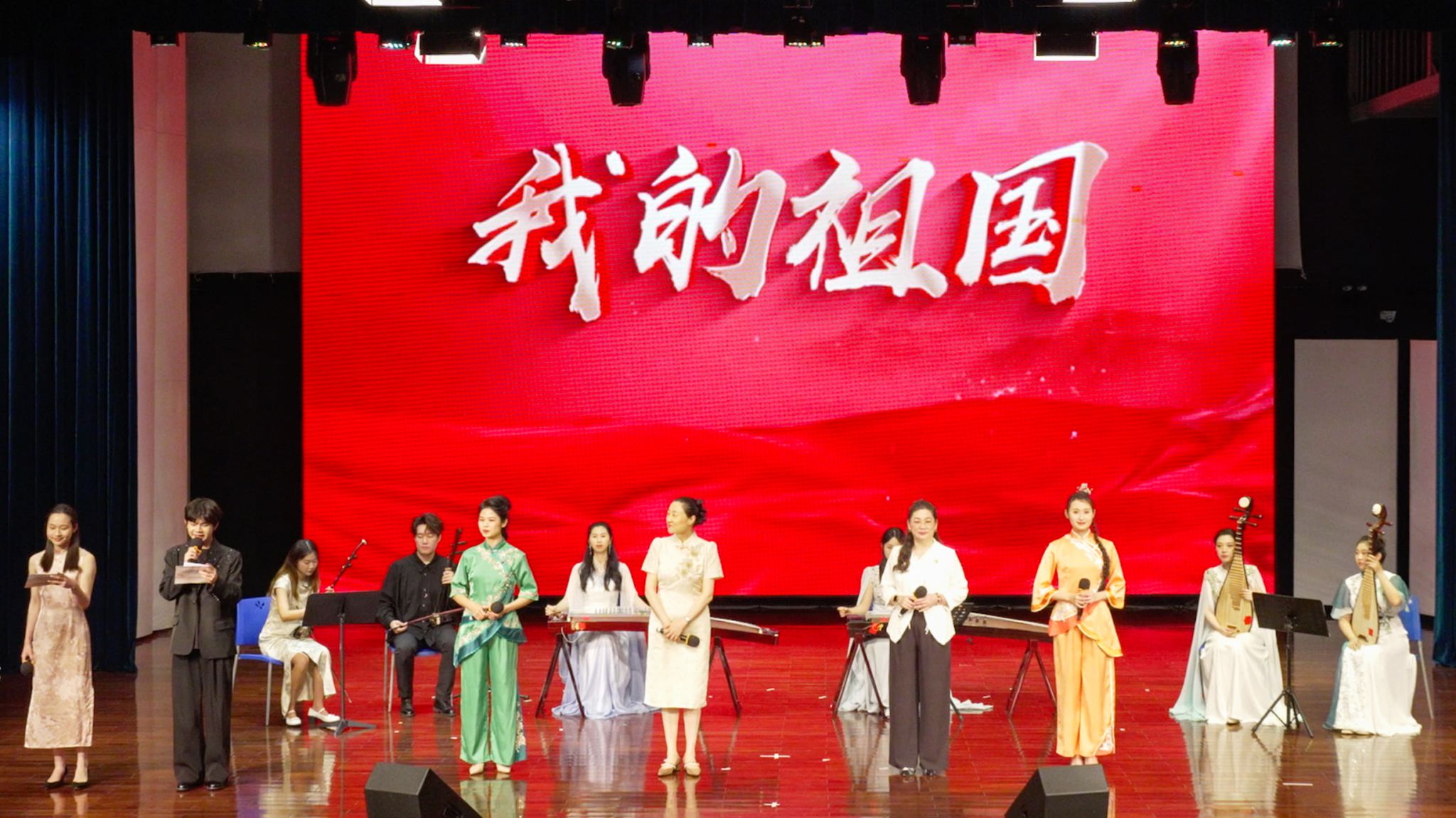当民乐合奏《彩云追月》的悠扬旋律轻快地响起,三位传承人和北师港浸大音乐系实务副教授汪洁用中英文共同献唱,为这首传统乐曲增添了文化交融的独特韵味。最后,民乐合奏《我的祖国》雄壮激昂的旋律引发全场合唱,深情而热烈的歌声使全场气氛达到高潮。