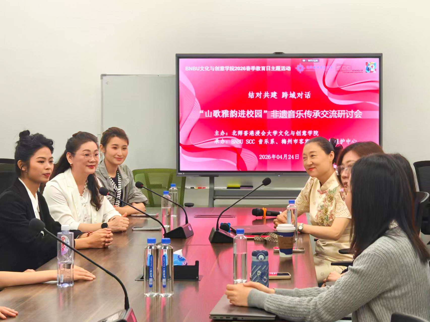2026年4月24日,由北师香港浸会大学(BNBU)文化与创意学院主办,音乐系与梅州市客家山歌传承保护中心共同承办的“客韵薪传·声入人心”——国家级非遗“梅州客家山歌”进校园暨学生汇报音乐会,在BNBU校园成功举行。客家山歌剧非遗传承人杨苑玲携手青年演员陈婷霞、马嘉意,与音乐系的师生同台献艺,共同演绎了原汁原味的客家山歌和传统民乐。