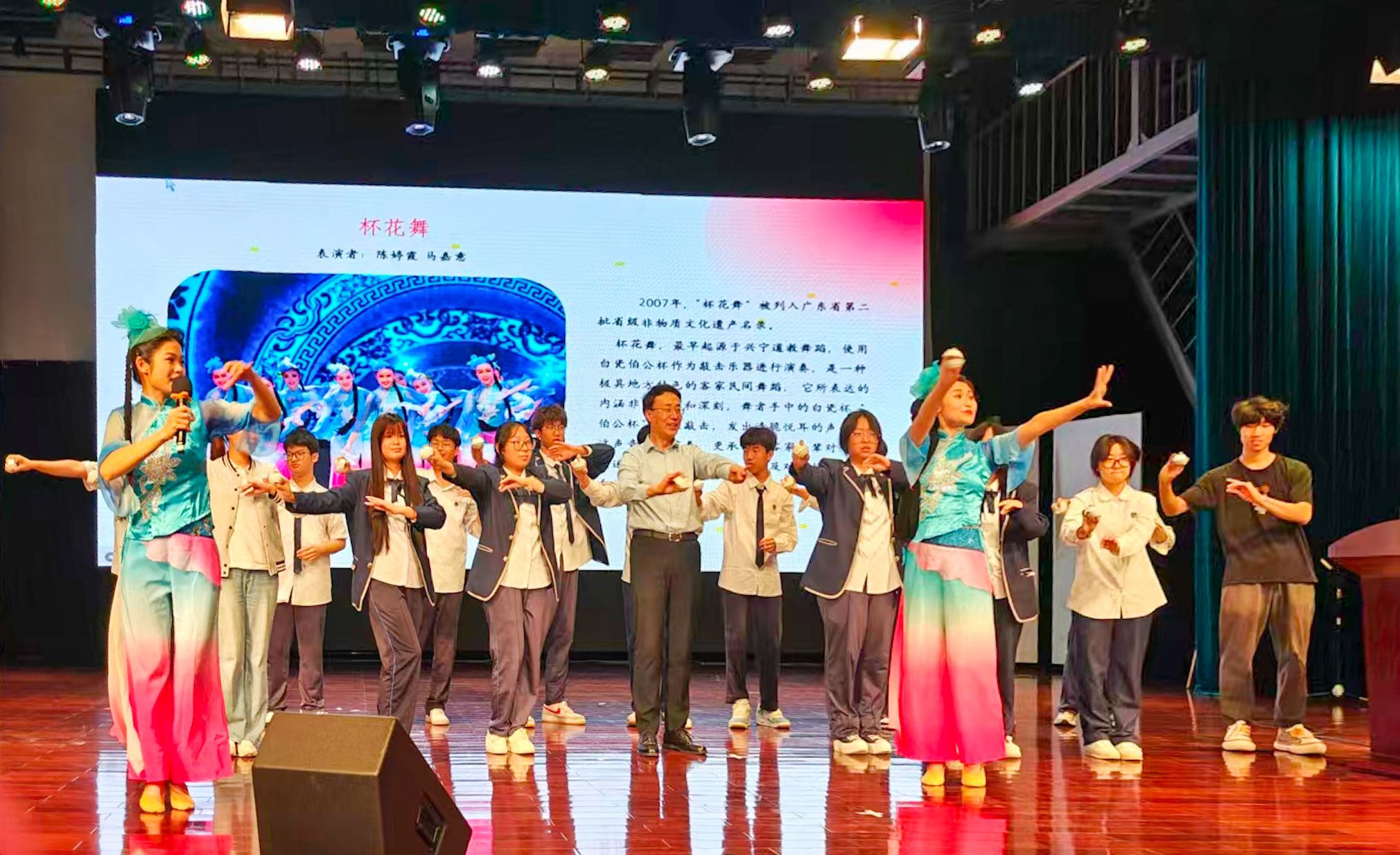 现场还特别设置了互动教学环节,为在场师生观众提供了体验非遗、学唱山歌、学跳杯花舞的机会,教学深入浅出,生动活泼,现场气氛热烈。