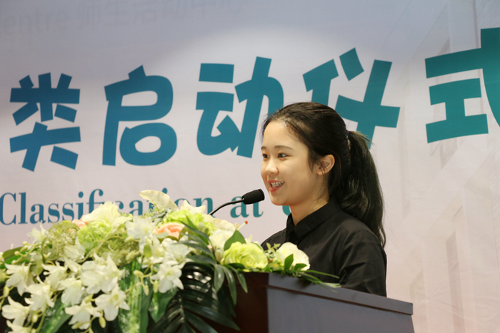在启动仪式上,珠海高新区建设环保局副局长沈洋在致辞中表示,UIC是高新区首个为响应垃圾分类号召而举办启动仪式的大学。她对校园内垃圾分类推进工作提出了四点倡议:将垃圾分类工作作为重点,落实责任;利用社团、竞赛等活动广泛宣传,营造氛围;借鉴、创新,发展出适合UIC的模式;发挥学生志愿者的作用,使垃圾分类任务长久且准确地执行。