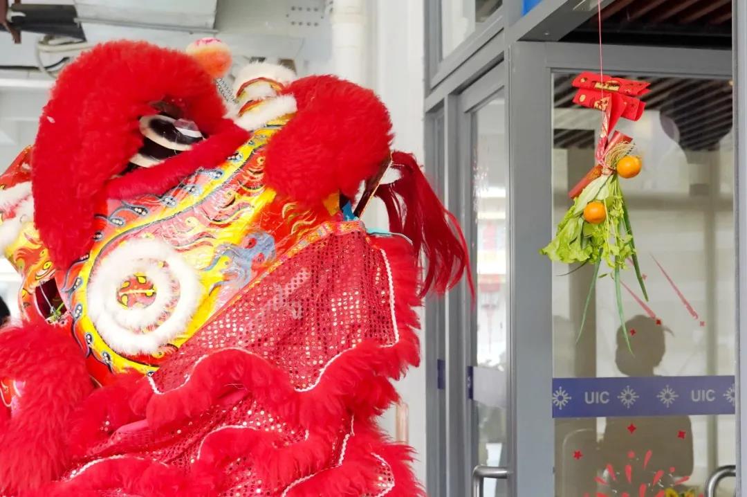 温灿(右)代表龙狮队祝福UIC师生在新的一年身体健康,心想事成,像每一头小狮子一样“醒醒定定(广东话)”