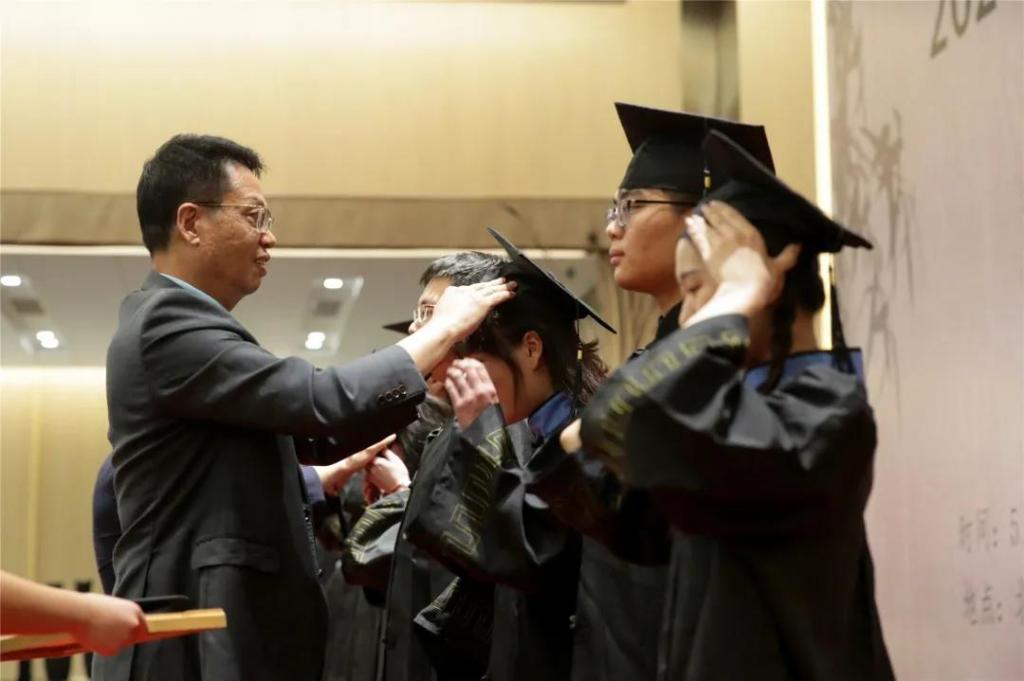 三拜三加,拜主宾。参礼学生着学士服,珠海慈善总会会长尤镇城(上图)和陈致教授(下图)为学生佩戴学士帽