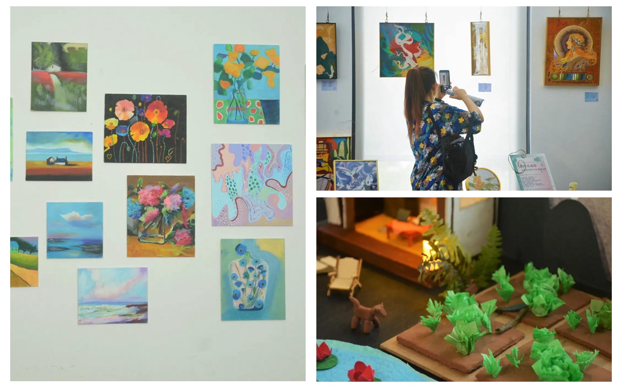 北师港浸大(UIC)全人教育艺术体验课程学生结业作品展"Chill on Saturday, Release the Soul"于5月17日在文化创意群落开展,共展出300多名学生的近400件作品,涵盖了掐丝珐琅、陶艺、纸艺、油画、水彩、插画、漆画、工笔水墨、玻璃工艺等艺术种类,还有雅乐、古琴等课程的衍生展品,种类繁多,表现形式多元,展览将持续至27日。