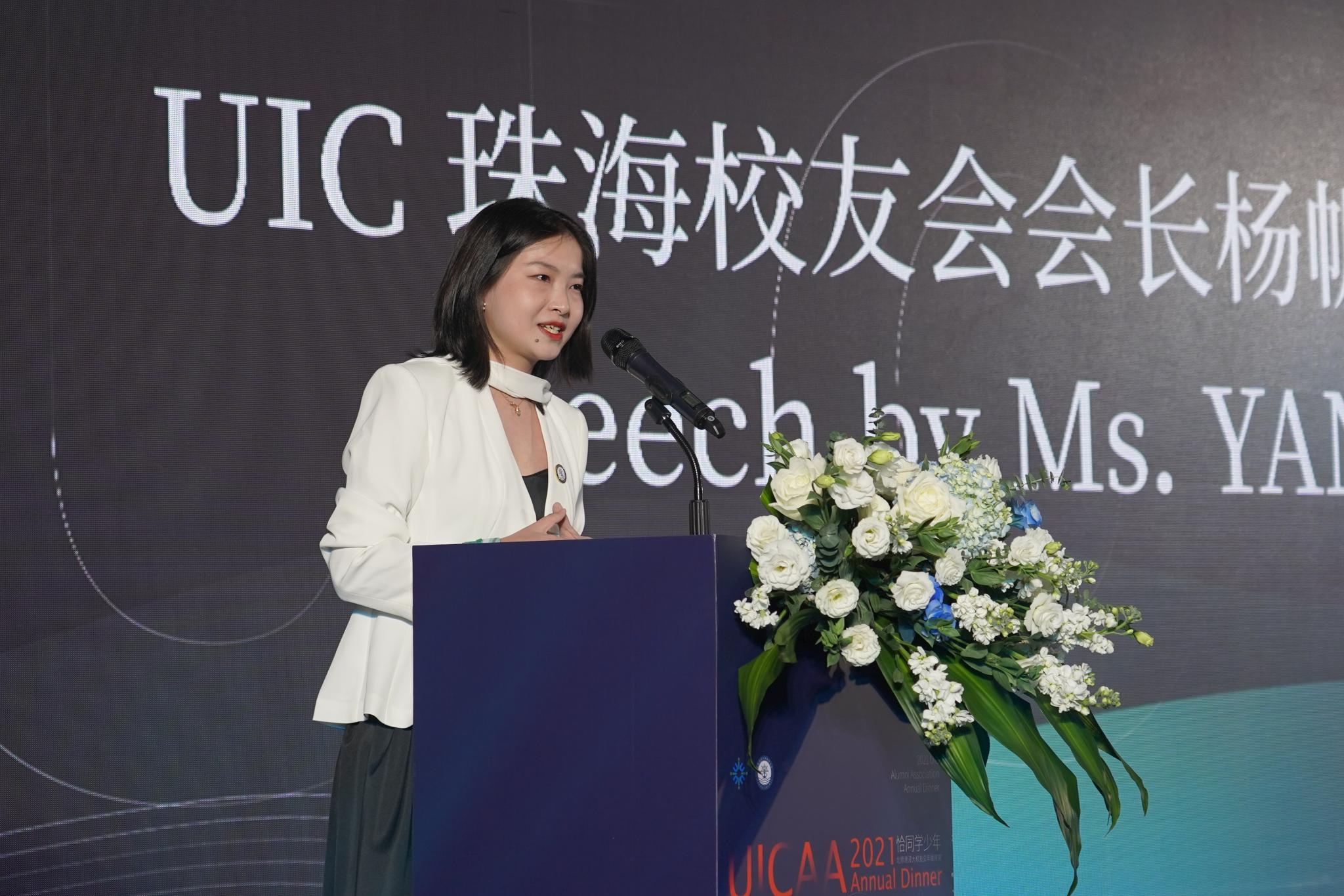 UIC珠海校友会会长杨帆女士在开幕致辞表示,校友会是校友情感的连接,期待UICer毕业后能为社会做出有益的贡献。