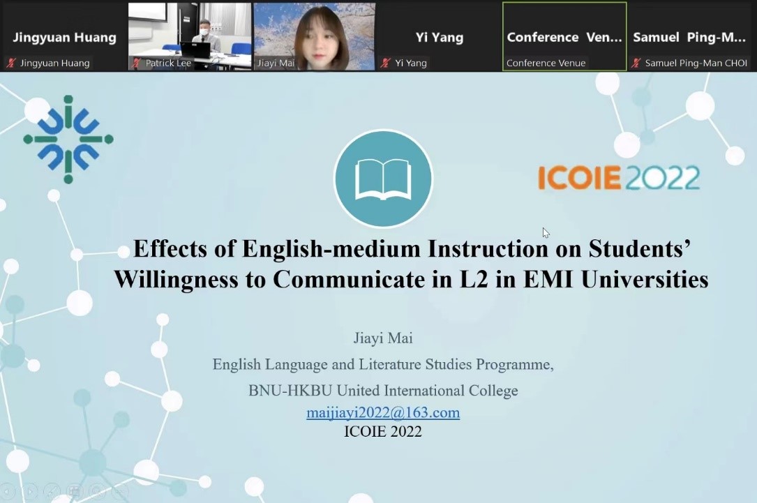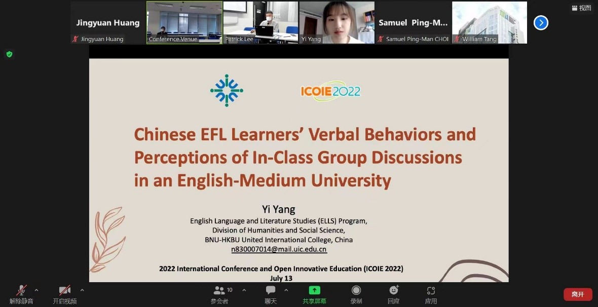 7月13日至15日,北师港浸大(UIC)2018级英语语言文学专业麦嘉仪、杨熠、黄靖媛、陈宣颖和郑雨宁五位同学在线参与在香港举行的2022开放与创新教育国际会议(ICOIE 2022)并发表论文。其中,麦嘉仪获得本届大会最佳学生论文奖。
