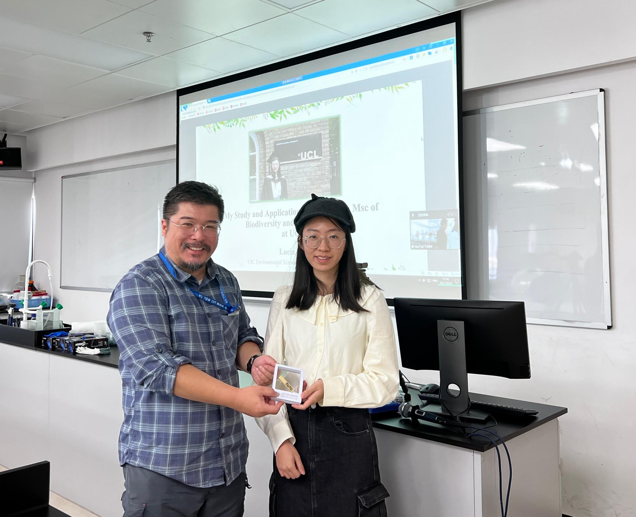 升学规划分享会上,生命科学系副系主任、副教授詹肇泰(左)为参与分享的UIC校友赠送纪念品