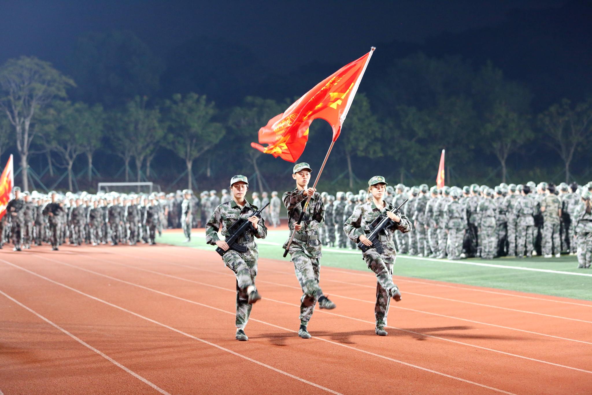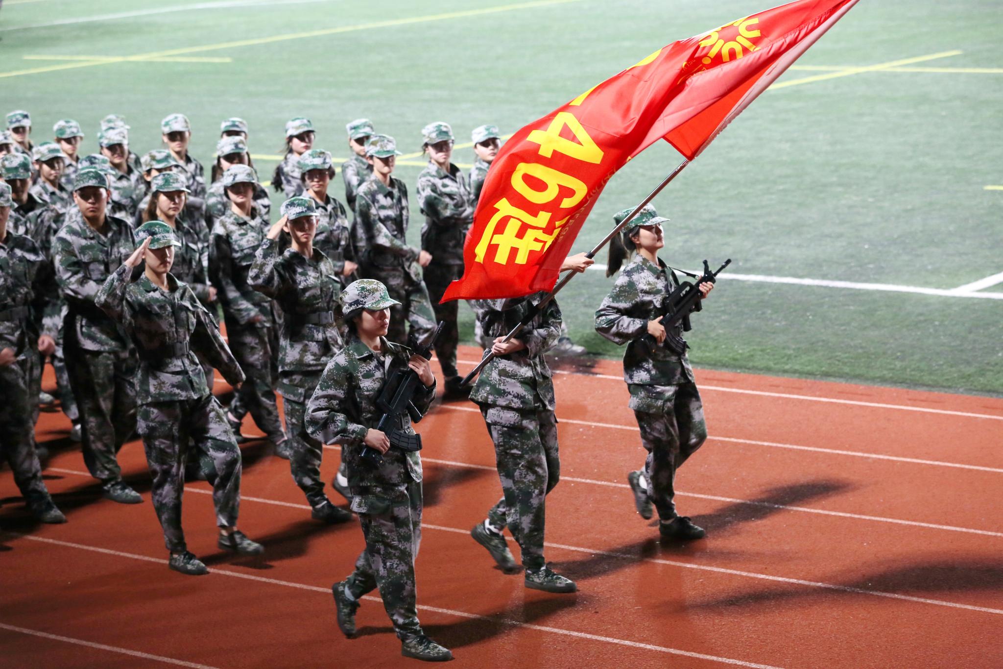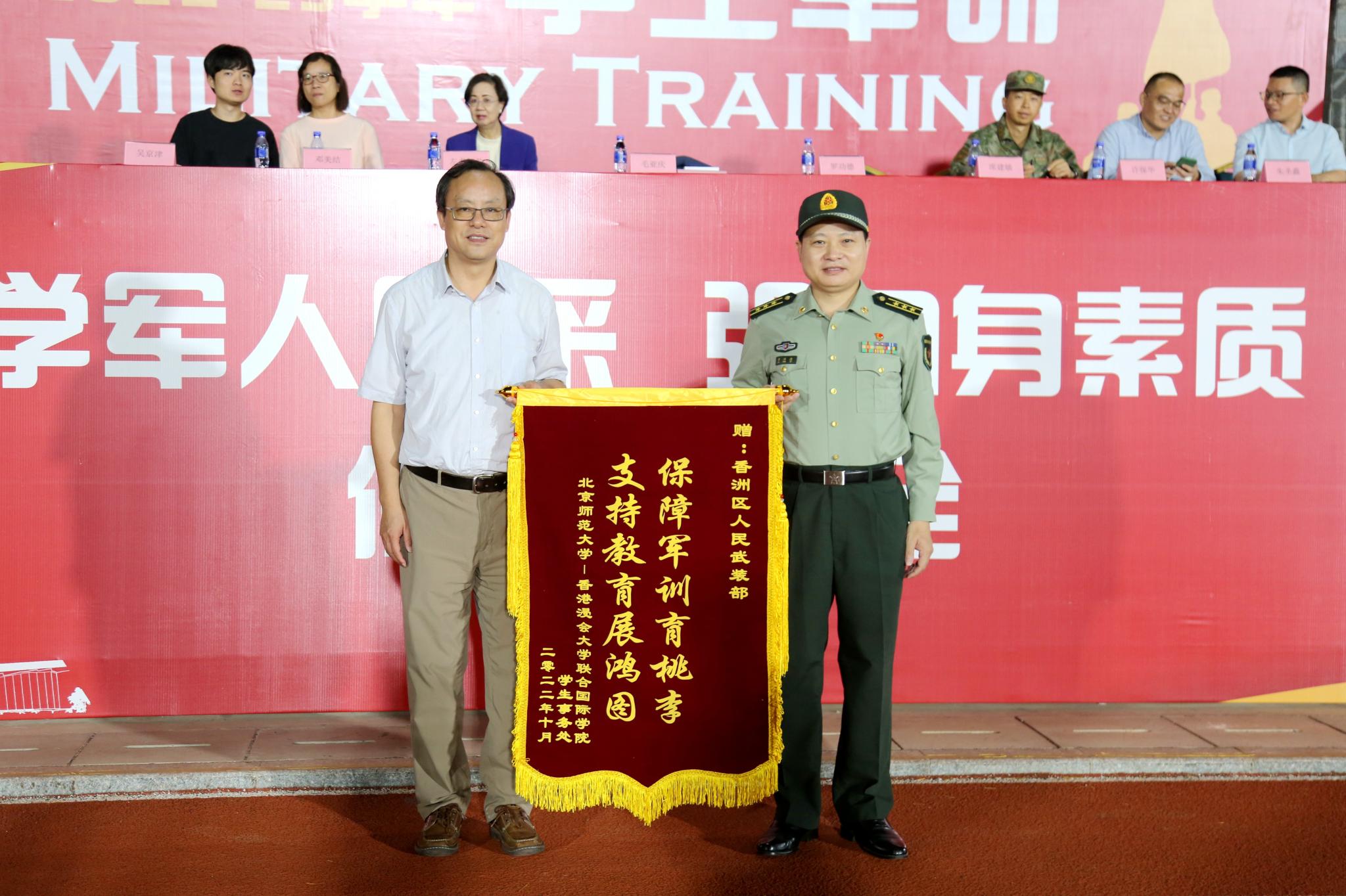 近日,北师港浸大(UIC)大一学生完成军训,在体育公园田径场举行汇报表演。