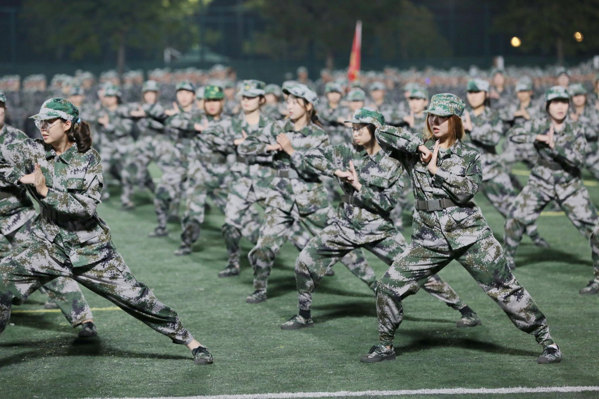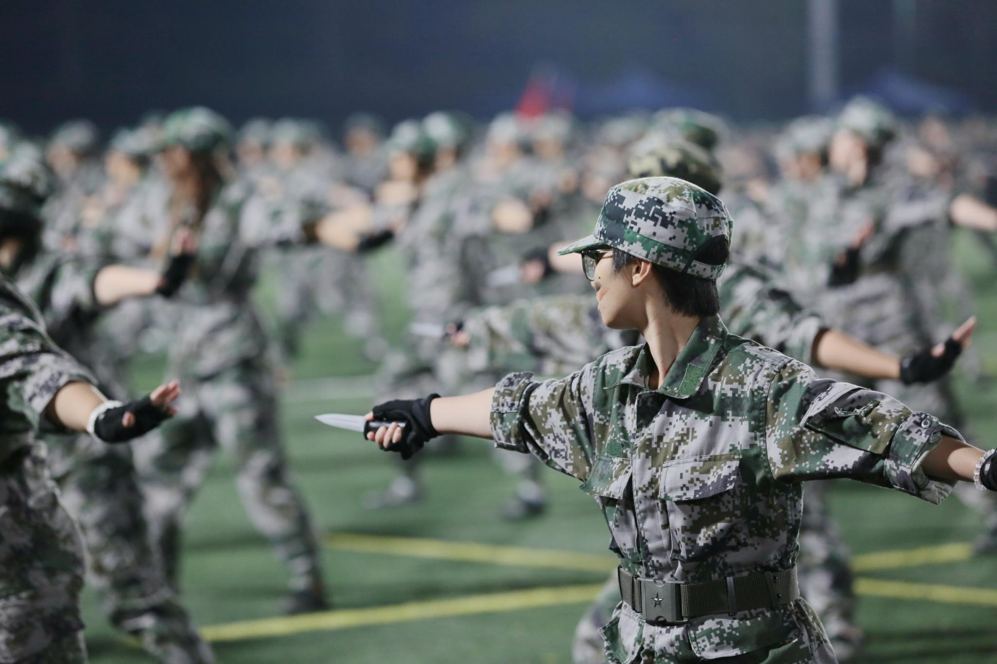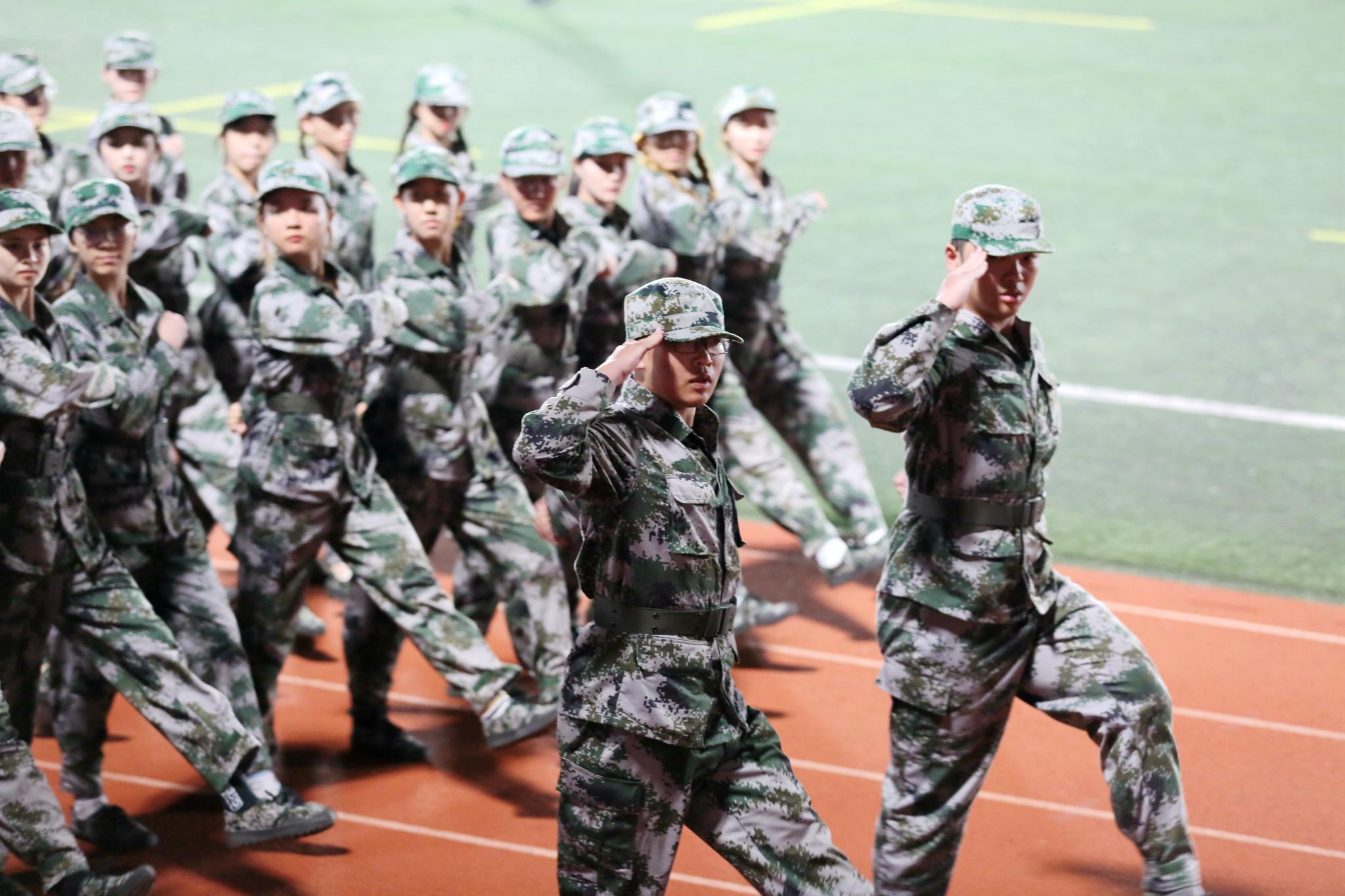 经过十余天的训练,同学喊着铿锵有力的口号,迈着整齐矫健的步伐,全面展示军训成果。分列式、军体拳、匕首操、擒敌拳等阵式接连上演,现场场面震撼,掌声连连。