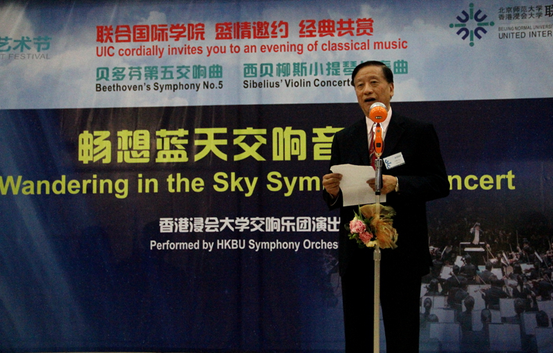 在音乐会之前,UIC举办了欢迎酒会,向嘉宾介绍潘明伦教授和朱丹先生的艺术成就。酒会由校长助理李宁宁主持。吴清辉校长在致欢迎辞时表示,他不是以校长的身份而是以听众的身份来听音乐会的,感谢潘明伦教授、朱丹先生和香港浸会大学交响乐团给大家带来共享诗意的机会。他强调UIC秉承了浸大的全人教育精神,着重加强学生艺术文化的教育和普及,希望UIC的交响乐团在将来也能有专场演出。