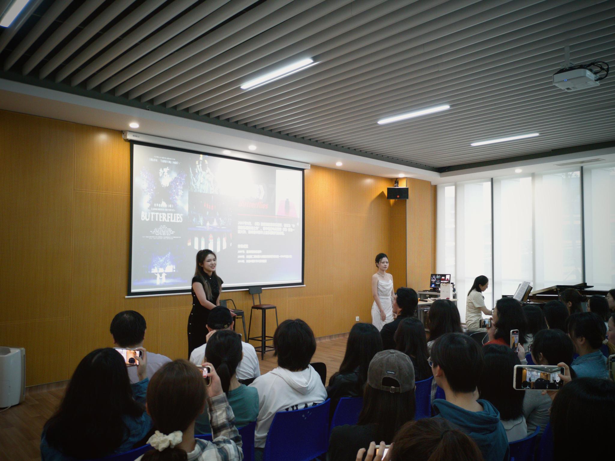 讲座互动环节,音乐系副教授汪洁与大一学生现场表演音乐剧《蝶》 中曲目