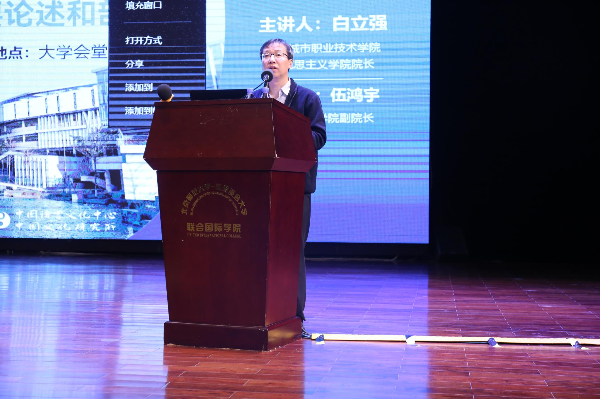 2023年11月15日下午,北师港浸大“形势与政策”大讲堂第八十二讲在大学会堂进行,主讲人珠海城市职业技术学院马克思主义学院院长白立强教授带来题为“深刻认识党的二十大关于中国式现代化的重要论述和部署”的演讲,为现场众多师生细致生动地讲解了有关中国式现代化的一些问题。演讲由通识教育学院副院长、中国语言文化中心执行主任伍鸿宇教授主持。