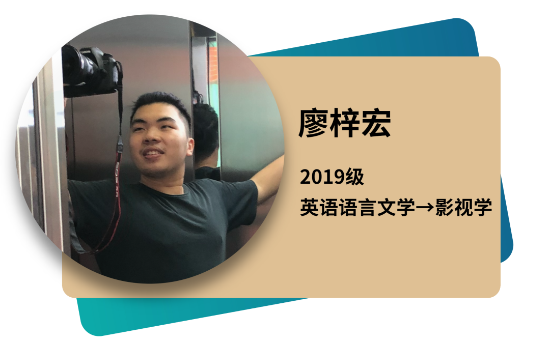 怀揣一个“电影梦”虽然英语语言文学专业的语言学导论、文学导论等课程对廖梓宏启发很大,但他心里一直有一个“电影梦”,于是,抱着"现在不学电影以后可能都没机会了"的心态,他顺利申请转到了在填报高考志愿时与自己擦肩而过的影视学专业。