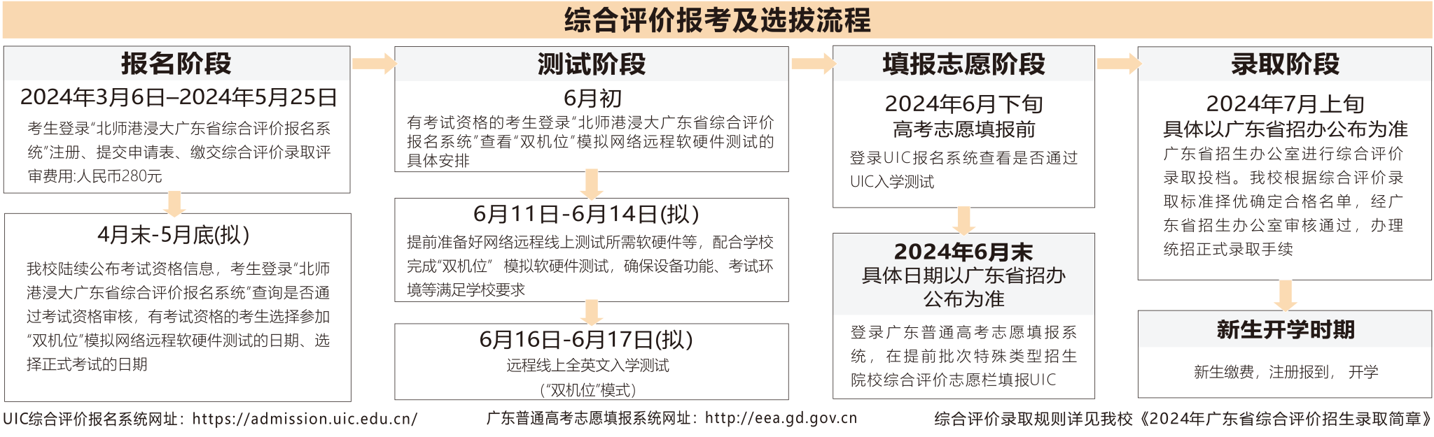 2024年,北师港浸大广东省综合评价入学测试,拟继续实行线上全英文考试,考生报考及选拔流程如下: