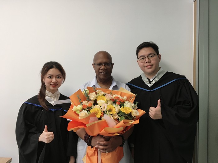 温巧雯和毕业论文导师Donald Weston Harper博士(中),及毕业论文搭档吴昊天合影