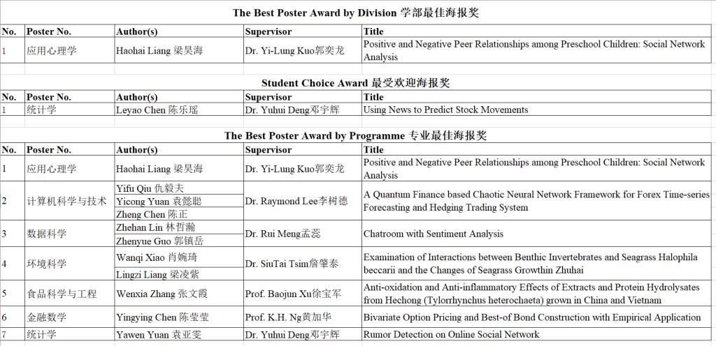 北师港浸大协理副校长、理工科技学部院长黄华雄教授在开幕视频中说:“这是我们第一次在线上举办海报展。疫情给我们所有人带来了重大挑战。最大的挑战之一就是如何通过在线工具来实现教学目标,将影响降到最低。然而,这次疫情也给我们带来了机遇,包括尝试新的方式来开展我们的教学和研究。本次海报展的研究课题非常多样化,非常感谢大家的共同努力,让学生和导师们可以分享他们出色的研究成果。”