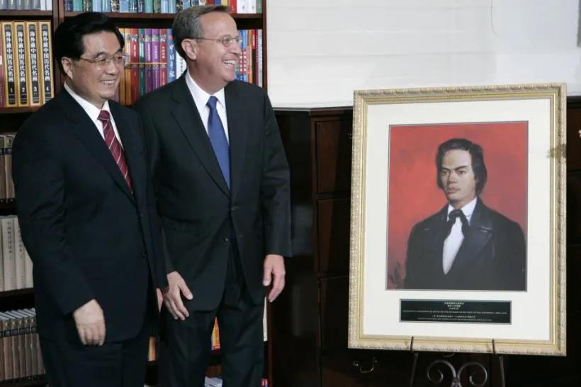 耶鲁校长莱文向胡主席赠送容闳画像