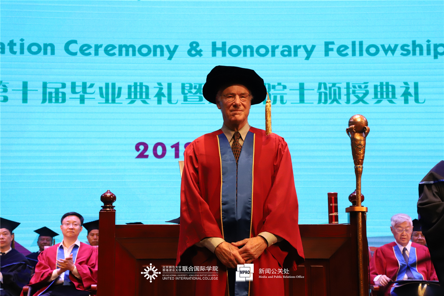 在毕业典礼上,UIC颁授荣誉院士荣衔予五位杰出人士,以表彰他们对国家、社会和教育事业的贡献,以及对UIC的支持。今年获嘉许的分别是美国心理学家、统计学家、加利福尼亚大学洛杉矶分校特聘教授Peter M. Bentler,科大讯飞创始人、现任公司董事长刘庆峰博士,香港科技大学创校校长吴家玮教授,北京大学哲学社会科学资深教授、北京大学博雅讲席教授叶朗,著名琵琶演奏家、中央音乐学院章红艳教授。