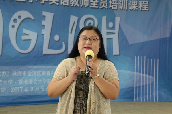 在第一天的开营仪式上,金湾区英语教研员冯晓颖代表区教育局发言,对本次参与培训的老师给予了厚望。这一批学员年龄跨度大,从23至53岁,其中有身怀六甲的准妈妈,也有初为人师的毕业生。