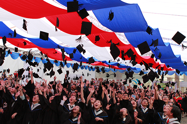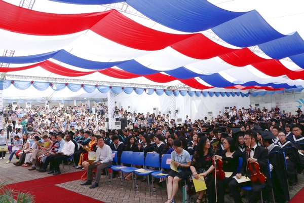 炎炎夏日下,毕业典礼在F区广场搭造的礼棚里举行。今年的礼棚设计有很大改进,还特别安装了多台空调器,整个会场庄严、喜庆,而又比较凉爽、舒适。身穿学士袍头戴学士帽的同学们逐一上台领取毕业证书,并与校长院长握手。众多远道而来的家长一起见证喜悦的时刻。