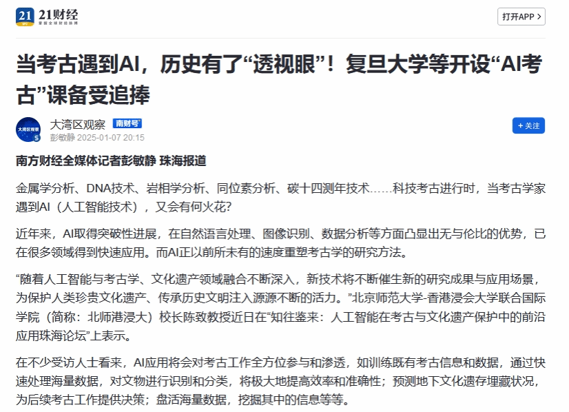 南方财经全媒体记者留意到,不少高校正极力加强跨学科合作,培养更多既懂考古又精通AI的复合型人才,以推动“AI+考古”领域的持续创新与发展。