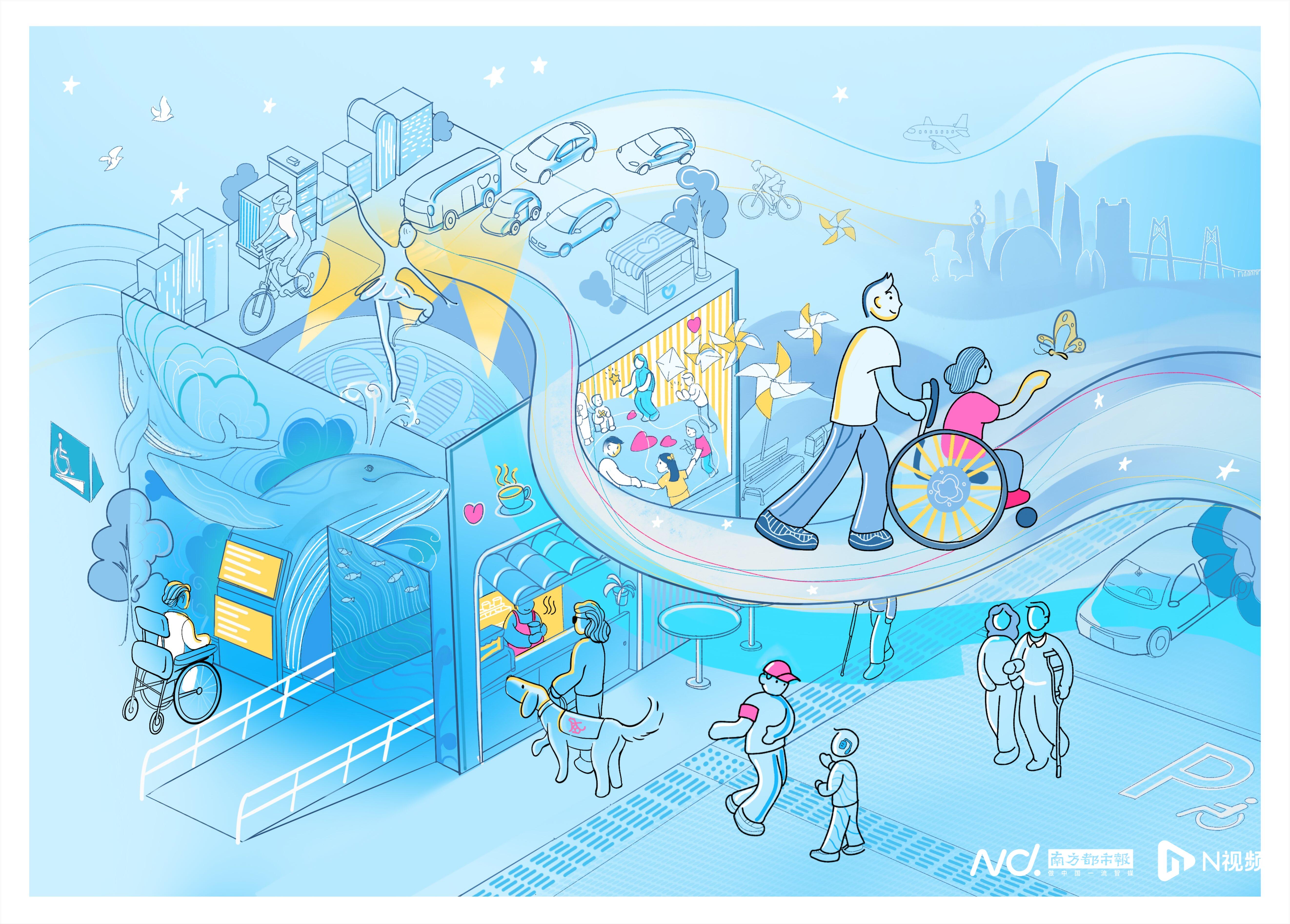 主视觉创作者、公益设计师谢文杰介绍,该作品名为《我们的无障碍城市》,展现了无障碍设施、无障碍信息交流、无障碍社会服务等内容,以及助残志愿者、残障运动员、轮椅使用者、老人、儿童等形象,从多个层面描绘了对无障碍城市建设的展望。
