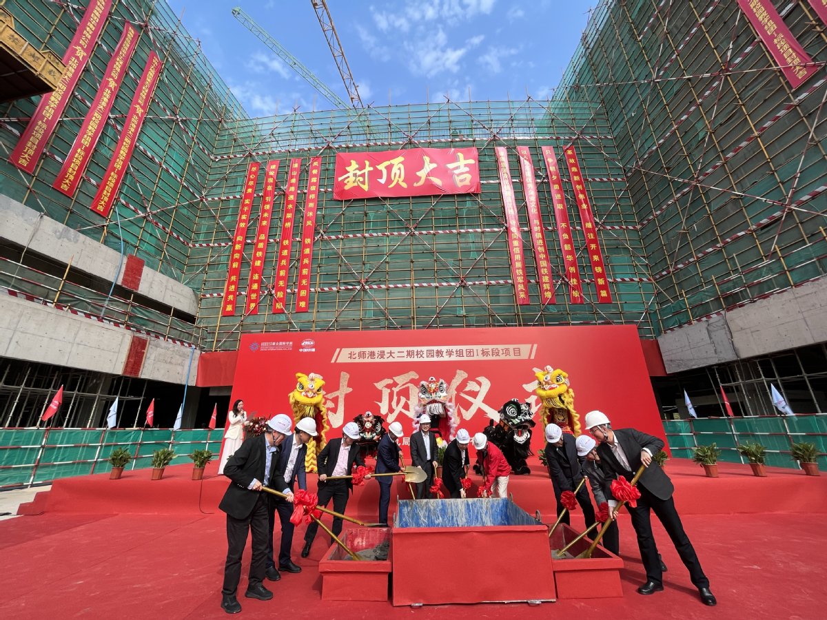 当天,北师港浸大师生和各界嘉宾还见证了二期校园教学组团I标段封顶,教学组团I标段建设面积约9.3万平方米,由五栋教学实验楼、一栋办公楼及配套设施组成。