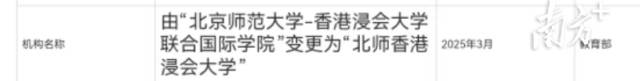 3月10日,教育部中外合作办学监管工作信息平台显示,2025年3月,北京师范大学—香港浸会大学联合国际学院更名北师香港浸会大学获教育部批准。