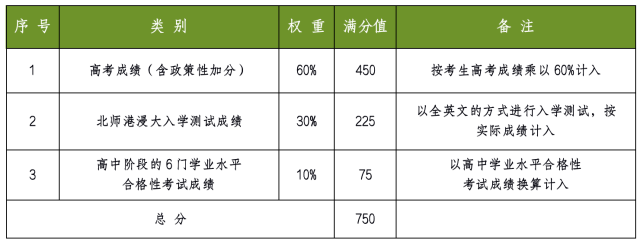 综合评价录取总成绩满分为750分。其中,高考成绩(含政策性加分)按60%的比例计入;北师港浸大入学测试成绩满分为225分,按实际成绩计入;考生高中阶段的思想政治、历史、地理、物理、化学、生物学6门学业水平合格性考试科目成绩均须达到合格,并按对应等级折算办法计入学业水平合格性考试成绩。