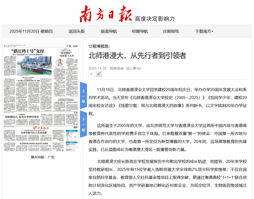 这所诞生于2005年的大学,由北京师范大学与香港浸会大学这两所中国内地与香港高等教育界代表性的学府携手创立于珠海。它承载着双重“第一”的使命:中国第一所内地与香港合作创办的大学,也是第一所定位为新型博雅的大学。20年间,这场高等教育的先锋实践,已从蓝图成长为粤港澳大湾区一股重要创新力量。