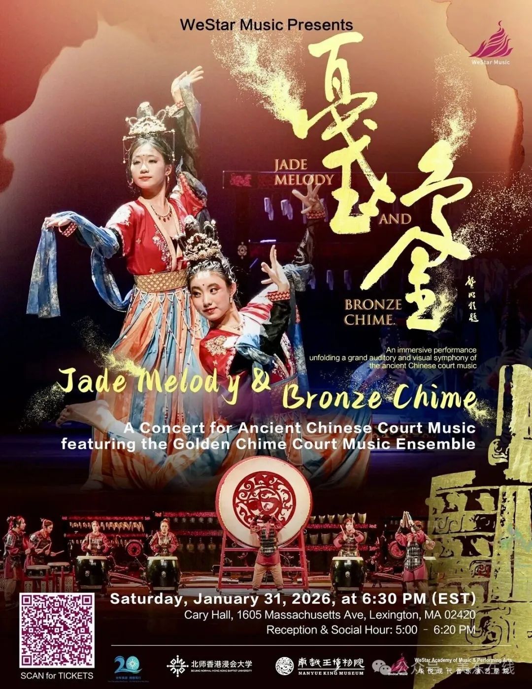 On the evening of January 31, 2026, the ancient Chinese court bianzhong concert “Chiming Jade and Ringing Gold,” jointly presented by WeStar Music, the Yuzhen Jinsheng Yayue Ensemble of Beijing Normal University–Hong Kong Baptist University, and the Nanyue King Museum, was grandly staged at the historic Cary Memorial Hall in Lexington, Massachusetts.