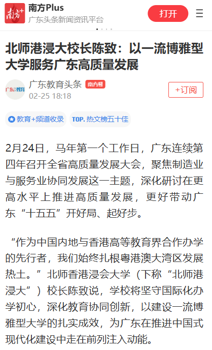 “作为中国内地与香港高等教育界合作办学的先行者,我们始终扎根粤港澳大湾区发展热土。”北师香港浸会大学(下称“北师港浸大”)校长陈致说,学校将坚守国际化办学初心,深化教育协同创新,以建设一流博雅型大学的扎实成效,为广东在推进中国式现代化建设中走在前列注入动能。
