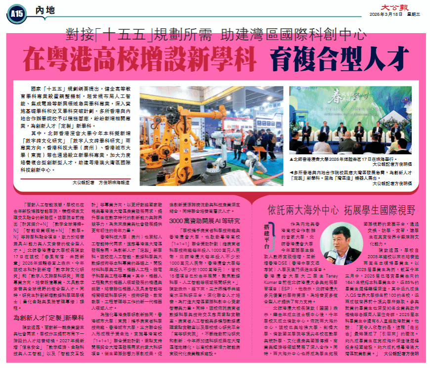 陳致透露,學校自2005年建校以來已培養逾兩萬名本碩博畢業生。以2025屆畢業生為例,截至今年三月中,2025屆已落實畢業去向的1641名統招本科畢業生中,近85%的畢業生選擇繼續深造,其中近九成進入QS世界大學排名前100的名校,近兩成被世界前十頂尖學府錄取。參與就業的畢業生也深受知名企業與政府機構等各類用人單位青睞,2025屆本科畢業生中還有6人直接赴港就業。他說:「更令人欣慰的是,這種『走出去』最終匯成了『引回來』的暖流。約九成畢業生在完成海外深造後選擇投身祖國建設,約六成扎根粵港澳大灣區就業創業。」\大公報記者方俊明
