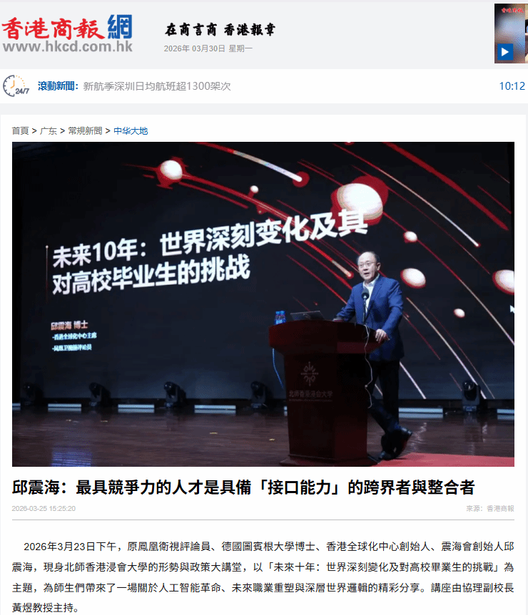 2026年3月23日下午,原鳳凰衛視評論員、德國圖賓根大學博士、香港全球化中心創始人、震海會創始人邱震海,現身北師香港浸會大學的形勢與政策大講堂,以「未來十年:世界深刻變化及對高校畢業生的挑戰」為主題,為師生們帶來了一場關於人工智能革命、未來職業重塑與深層世界邏輯的精彩分享。講座由協理副校長黃煜教授主持。
