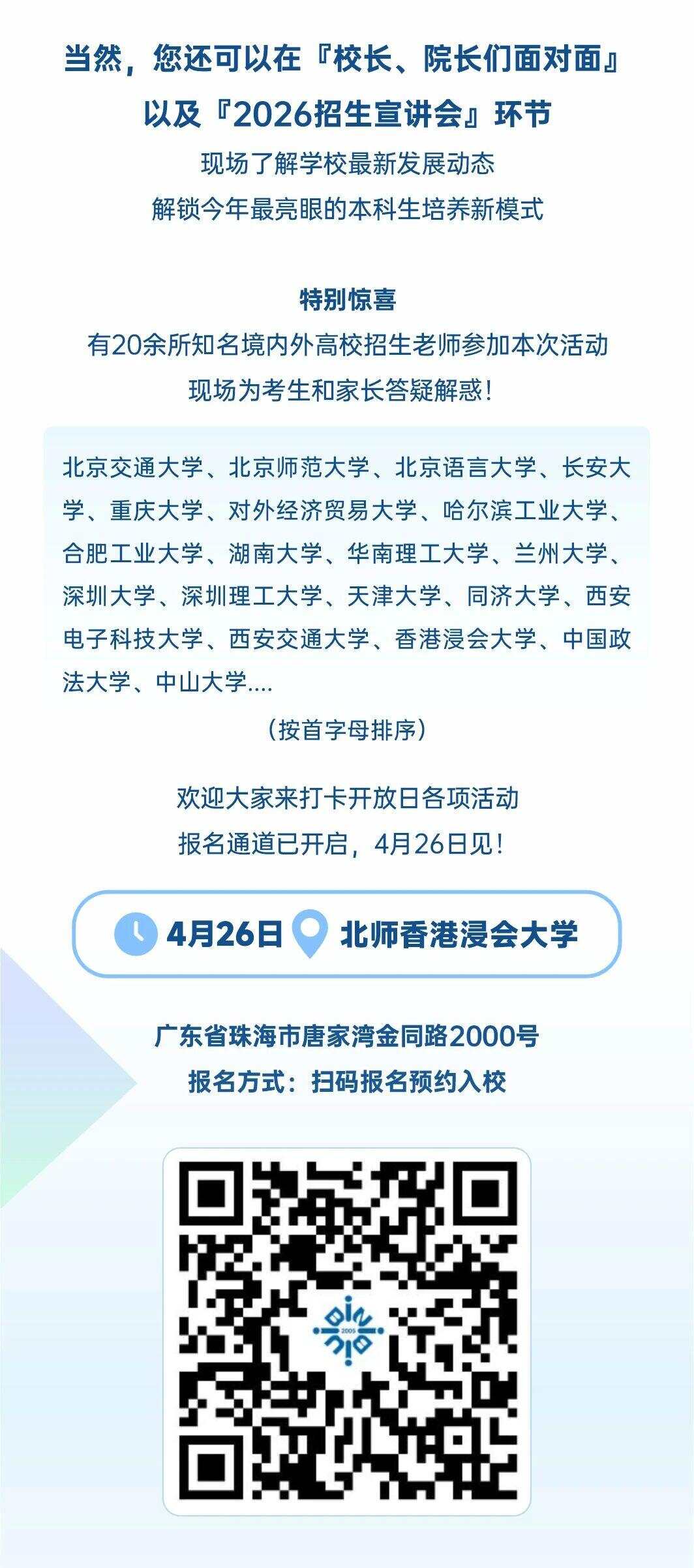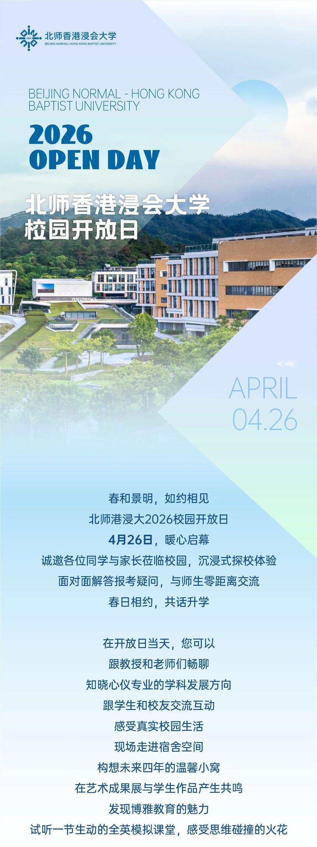 近日,北师香港浸会大学正式发布2026年广东省综合评价招生录取简章。为了让广大学生、家长更好地了解学校,4月26日,北师港浸大2026校园开放日暖心启幕,诚邀各位同学与家长莅临校园,沉浸式探校体验。学校老师将面对面解答报考疑问,零距离交流。春日相约,共话升学。