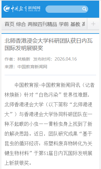 中国教育报-中国教育新闻网讯(记者 林焕新)针对“白色污染”世界性难题,北师香港浸会大学(以下简称“北师港浸大”)与香港浸会大学协同科研团队在一种不起眼的小虫——黄粉虫身上找到了新的解决思路。近日,团队研究成果“基于昆虫的循环经济:将塑料废弃物转化为关键生物材料”于第51届日内瓦国际发明展上斩获银奖。