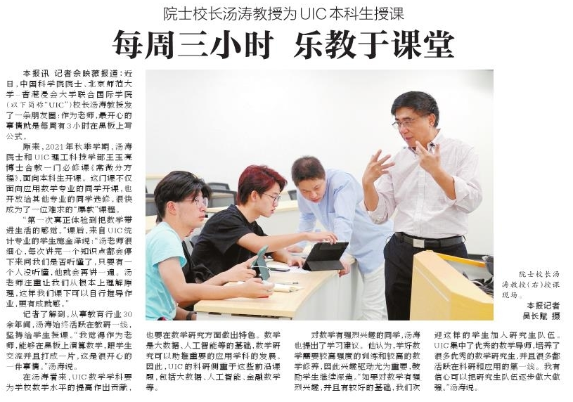 原来,2021年秋季学期,汤涛院士和UIC理工科技学部王玉亮博士合教一门必修课《常微分方程》,面向本科生开课。这门课不仅面向应用数学专业的同学开课,也开放给其他专业的同学选修,很快成为了一位难求的“爆款”课程。