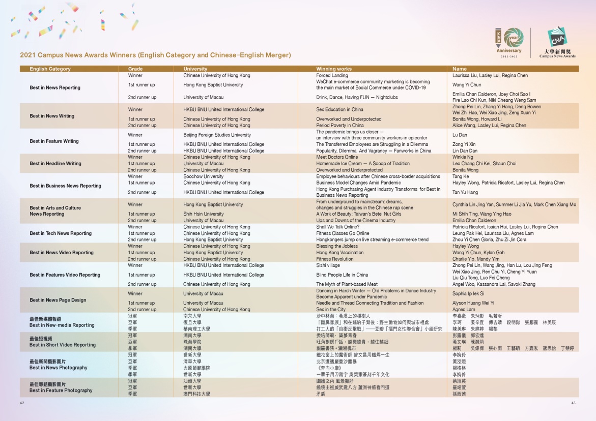 今年获奖的学生代表也通过线上线下的方式发表获奖感言。香港珠海学院的黄文瑛和陈漪莉获得此次最佳短视频亚军,她们首先感谢受访者和老师的帮助,在采写过程中感受最深的是要确保信息来源的重要性。同时,希望通过报道让大家了解基层人士现在面对的困难,特别是在现在疫情之下。