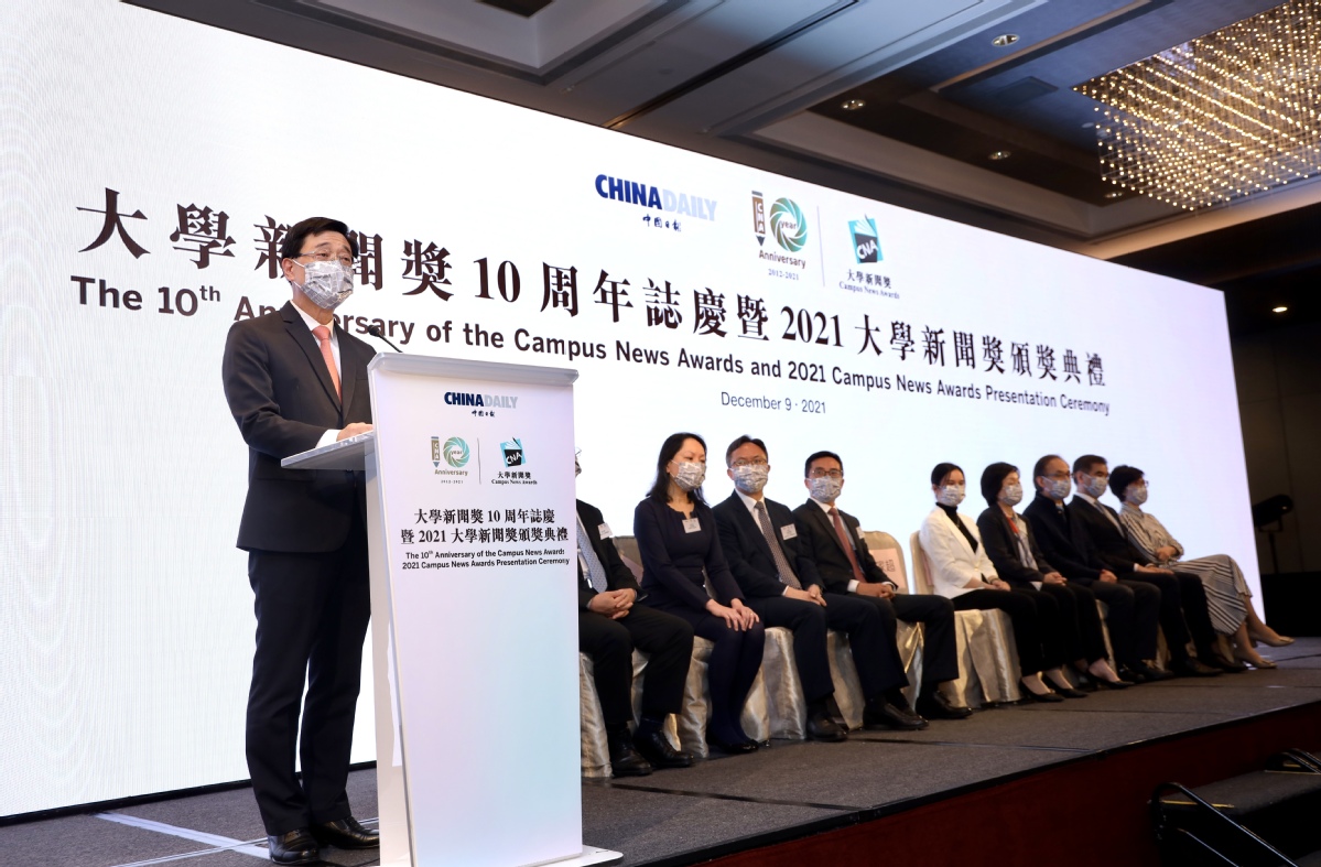 中国日报香港12月9日电(记者张耀月张亢)由中国日报举办的“大学新闻奖10周年志庆暨2021大学新闻奖颁奖典礼”今日在香港举行。香港特别行政区政务司司长李家超主礼并致辞,香港中联办宣文部副部长郑琳、香港中联办台务部副部长肖洪、香港特别行政区教育局副局长蔡若莲、香港特别行政区政府新闻处署理处长吴绮媚、香港大公文汇传媒集团副董事长兼总编辑李大宏等嘉宾,以及150位师生和新闻界人士出席。