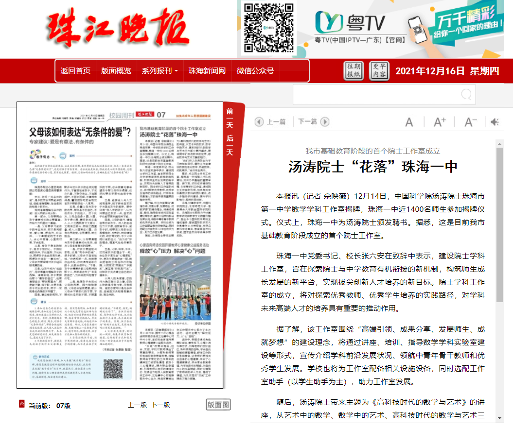 据悉,成立院士学科工作室,是珠海一中加强人才队伍建设、夯实办学基础的重要举措。接下来,该校还将建设物理、化学等学科工作室,通过院士工作室的引领,加快相关学科高层次教科研团队建设,进一步推动学科建设、提升学科影响力、促进协同创新。