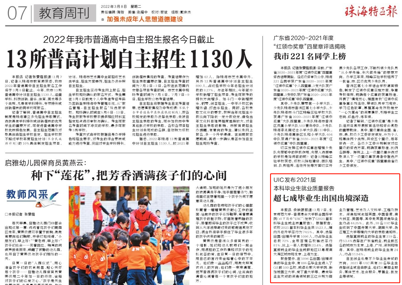 本报讯佘映薇报道:3月7日,北京师范大学-香港浸会大学联合国际学院(以下简称“UIC”)发布了《2021届本科毕业生就业质量报告》。根据报告,该校2021届本科毕业生共1523人,境内外总升学率约为74.5%。其中,选择出国/出境升学有1096人,约占毕业生总数72%,全球百强名校输送率约81%,比上一年人数增长23.4%。选择直接就业的毕业生就职地区以粤港澳大湾区城市和北京、上海为主。