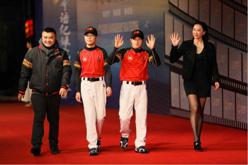 纪录电影《棒!少年》联合出品人孙岭峰(左一),影片主人公棒球少年梁正双、马虎,章硕