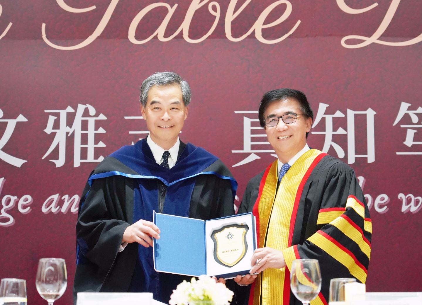 中國科學院院士、北師港浸大校長湯濤向梁振英致送紀念品。(受訪者供圖)