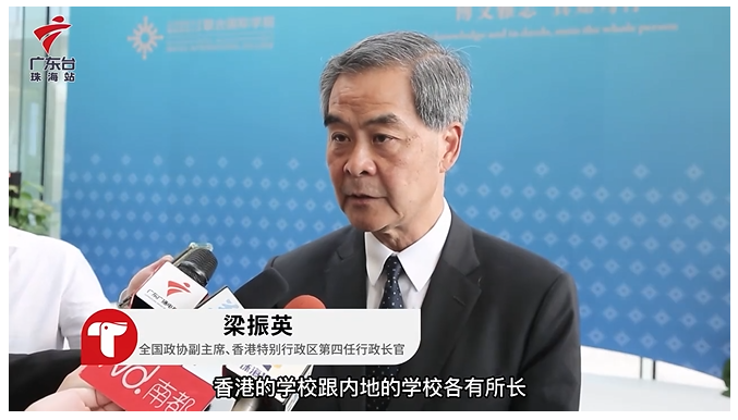 梁振英谈到,香港和内地的高校各有所长,香港学校的师资、课程、教学语言都比较国际化,香港在教育发展的某些方面可以给内地起到借鉴作用,内地的教育事业发展又对香港教育发展起到了传递和吸引作用。所以香港的学校不应该把自己困在深圳以南,而不走出香港。双方要进一步相互借鉴、共同提高。两地青年应充分利用日益增多的高校教育资源和时代机遇,拓展国际视野,积极走向国际,将自己打造成能在社会挑战中乘风破浪的有为人才,为湾区发展做出贡献。