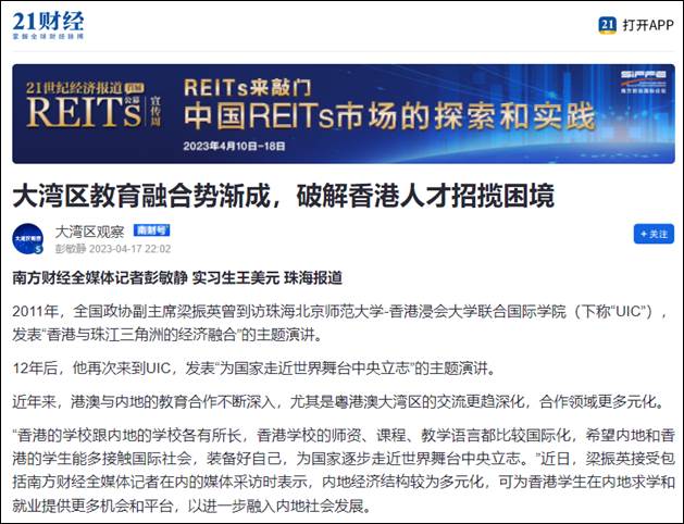 2011年,全国政协副主席梁振英曾到访珠海北京师范大学-香港浸会大学联合国际学院(下称“UIC”),发表“香港与珠江三角洲的经济融合”的主题演讲。