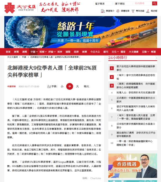(大公文匯網記者方俊明)本網記者17日從北京師範大學-香港浸會大學聯合國際學院(簡稱「北師港浸大」)獲悉,美國斯坦福大學與愛思唯爾數據庫10月發布了「全球前2%頂尖科學家榜單」,北師港浸大共有9位學者入選。