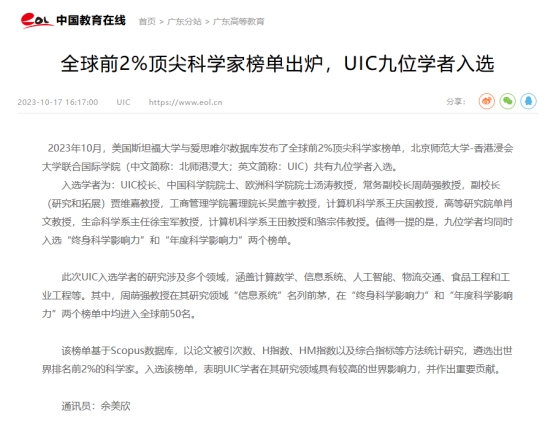 该榜单基于Scopus数据库,以论文被引次数、H指数、HM指数以及综合指标等方法统计研究,遴选出世界排名前2%的科学家。入选该榜单,表明UIC学者在其研究领域具有较高的世界影响力,并作出重要贡献。