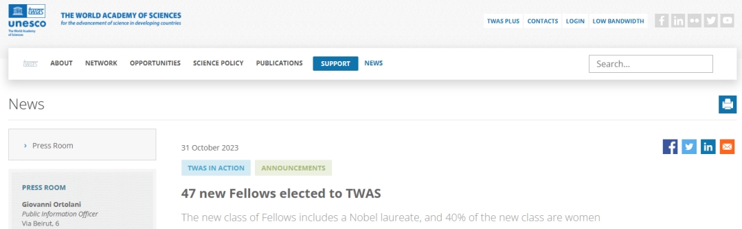 近日,发展中国家科学院(TWAS)公布新增院士名单,共增选出47位发展中国家科学院院士。