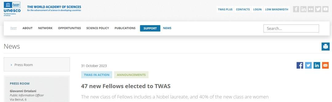 南都讯 近日,发展中国家科学院(TWAS)公布新增院士名单,共增选出47位发展中国家科学院院士。本次增选院士来自全球24个国家和地区,其中6位来自中国内地高校和机构。中国科学院院士、欧洲科学院院士、北京师范大学-香港浸会大学联合国际学院(中文简称:北师港浸大;英文简称:UIC)校长汤涛教授当选,是2023年中国数学领域唯一当选人。